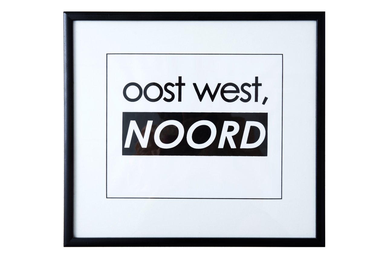 Sterk dadaïstische pop-art print met daarop het aloude spreekwoord (1914): "Oost west, thuis best". Geheel volgens zijn volkskunstige en Rotterdamse aard, stelt printmaker MARIO dat; 'als het korter kan, doe het dan'. Zodoende werd thuis best door NOORD vervangen. Gesigneerd en ingelijst!